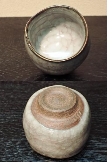 非常に人気の青磁に赤丸文が素敵な紅白瓷のぐい呑です。